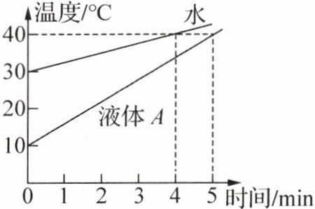 12. 为了解液体A的吸热能力,小悦用同一个酒精灯分别加热1kg水和1kg液体A,用测得的数据绘制了液体温度随时间变化的关系图像如图所示.该酒精灯每分钟消耗酒精的质量为1g,q酒精$= 3×10^7J/kg,c$水$= 4.2×10^3J/(kg·℃),$则下列说法正确的是( )