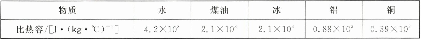 |比热容$/[J·(kg·℃)⁻^1]$|$4.2×10^3$|$2.1×10^3$|$2.1×10^3$|$0.88×10^3$|$0.39×10^3$|