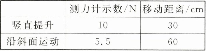 (2)由表中数据可知,利用斜面拉动小车时拉力 $ F_{2}=5.5\ N<10\ N $,可知利用斜面可以省力;利用斜面拉动小车时拉力做的功 $ W_{2}=F_{2}s=5.5\ N×0.6\ m=3.3\ J>W_{1}=3\ J $,所以使用斜面不能省功.