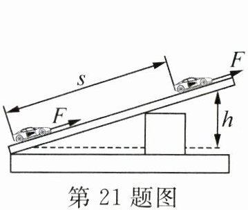 21. 某实验小组想探究使用斜面能否省功、省力.如图所示,已知斜面长 s= 60 cm,与之对应的高 h= 30 cm.现用弹簧测力计进行两次操作:第一次操作:沿竖直方向匀速提升小车;第二次操作:沿斜面方向匀速拉动同一辆小车.记录数据如表所示: