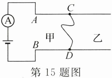 15. 甲、乙两地之间沿直线架设了两条输电线,已知每条输电线每千米的电阻为 0.2 Ω.输电线在某处发生了短路,为确定短路位置,检修员在甲地将电流表接入如图所示的电路,电压表应接在______(选填“A、B”或“C、D”)两点之间;若电压表和电流表示数分别为 4 V 和 0.5 A,则短路位置离甲地______km.
