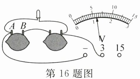 16. 如图所示,将两种金属片 A、B 分别插入柠檬制成“柠檬电池”,能使发光二极管发光,其中金属片______(选填“A”或“B”)是电池的正极;发光二极管是由______(选填“超导体”“绝缘体”或“半导体”)材料制成的,如果图中的二极管断路,则电压表______(选填“仍有”或“没有”)示数.