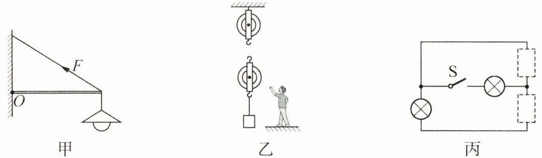 (1)如图甲,用杆和绳将电灯吊起,O 点是支点.请画出拉力 F 的力臂 L 及阻力$ F_2$的示意图.