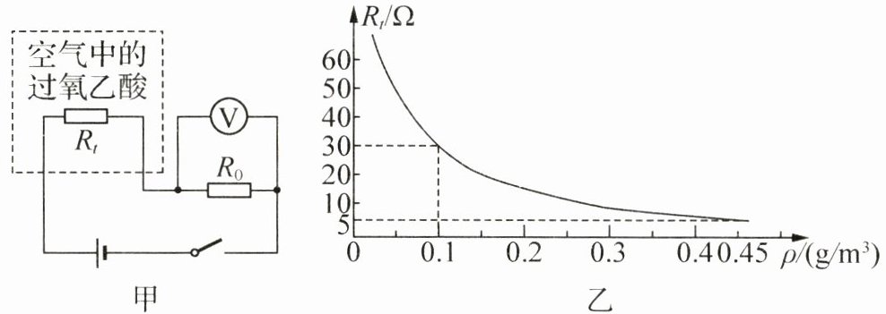 23. 某小组为了测量教室空气中过氧乙酸气体的浓度,用电压表改装成检测仪,如图甲所示.已知电源电压为 6 V,定值电阻 R₀的规格是“3 Ω 0.4 A”,电压表的量程为 0~3 V,过氧乙酸气体传感器$ R_1$的阻值随过氧乙酸气体浓度ρ的变化关系如图乙所示.