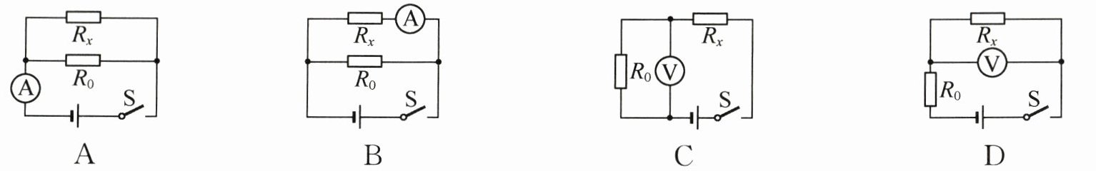 10. 力敏电阻 $R_{x}$ 的阻值随所受压力的增大而减小,现要设计一个电路,使得压力增大时电表示数增大,下列图示电路中不符合要求的是( )
