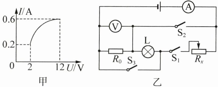 15. 额定电压为 12 V 的灯泡 L,其 I - U 图像如图甲所示.如图乙所示电路,电流表量程为 0~3 A:当 $S_{1}$、$S_{2}$ 闭合,$S_{3}$ 断开时,电压表示数为 12 V,电流表示数为 1.2 A;当 $S_{1}$ 闭合,$S_{2}$、$S_{3}$ 断开时,将滑动变阻器 $R_{x}$ 的滑片 P 移到中点,电压表示数为 2 V.则( )