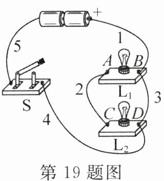 19. 小华连接了如图所示的电路,小明检查后指出其中的错误并进行改正:若闭合开关S,电路将发生______(选填“短路”或“断路”)故障;为使灯泡$L_1、$$L_2$串联,拆除导线______(填数字)即可;为使$L_1、$$L_2$并联,需将导线4的右端改接到接线柱______(选填“A”“B”或“C”)上.