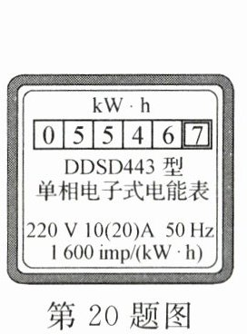 20. 小明观察家中的电能表示数如图所示为______kW·h.现仅接通一台电热水器,观察到电能表指示灯4min内闪烁160次,则4min内电热水器消耗电能______度,电热水器的实际功率为______W.