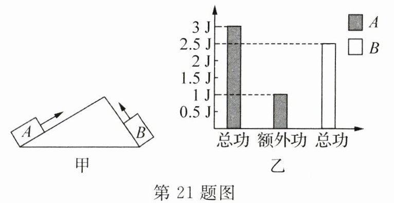 21. 如图甲所示,斜面静置于水平面上,小明同学将A、B两个完全相同的物体,分别沿左、右两侧斜面由底端拉到顶端,做功情况如图乙所示.则小明对A做的总功为______J、有用功为______J;左、右两侧斜面的机械效率之比为______.