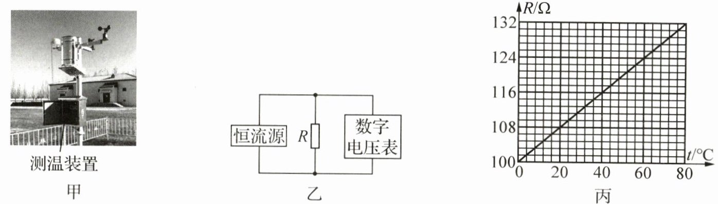 22. 如图甲所示为自动气象站中的测温装置,它的测温电路可简化为图乙,其中的“恒流源”是一个特殊电源,电流大小由电源内部结构决定,当电阻R变化时,通过R的电流大小保持不变.电阻R的阻值随温度变化的规律如图丙所示,通过数字电压表的示数可反映环境的温度,某次环境温度从10℃上升到20℃,电压表的示数变化了12mV.当温度的变化值相同时,电压表示数的变化值越大,该测温装置的灵敏度越高.由此可知:每升高1℃,R的阻值增大______Ω;环境温度为30℃时,电压表的示数为______mV;若要增大该测温装置的灵敏度,可换一个电流值更______(选填“大”或“小”)的恒流源.