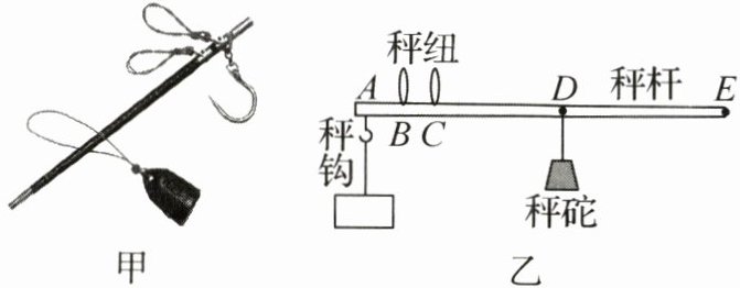 27. 新趋势 传统文化 (9分)杆秤是我国古代劳动人民的一项伟大发明,小明仿照图甲所示的杆秤用轻质细杆制作了一个杆秤(如图乙所示),B、C处各有一秤纽,秤砣最远可移至E点,已知AB= BC= 4cm,BD= DE.秤砣的质量为0.4kg,秤杆、秤钩和秤纽的质量均忽略不计.为了在杆秤上标定出测量需要的刻度值,将质量为3kg的钩码挂在秤钩上,用手提起B处的秤纽,移动秤砣在秤杆上悬挂的位置,至D点时秤杆达到水平平衡,此时就可以在D点标定出刻度值$m_1= 3kg,g$取10N/kg.求: