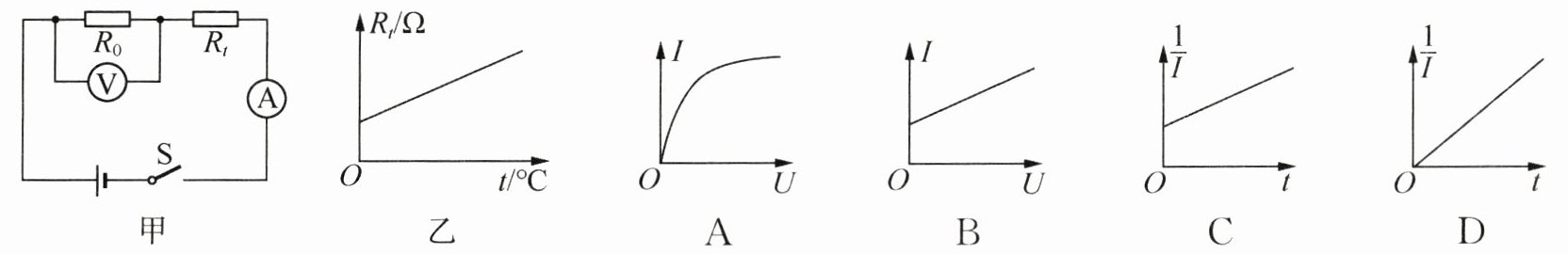 C 解析:由图甲可知,$R_{t}$与$R_{0}$串联,电压表测$R_{0}$两端的电压,电流表测电路中的电流.由题意知,电流表A的示数为I、电压表V的示数为U,根据欧姆定律可得$I=\frac{U}{R_{0}}$,$R_{0}$阻值不变,所以I与U成正比,则I - U关系图像是一条过原点的倾斜直线,故A、B错误;设电源电压为$U_{总}$,由欧姆定律可得$I=\frac{U_{总}}{R_{0}+R_{t}}$,则$\frac{1}{I}=\frac{R_{0}+R_{t}}{U_{总}}=\frac{R_{0}}{U_{总}}+\frac{R_{t}}{U_{总}}$,$R_{0}$、$U_{总}$均不变,则$\frac{1}{I}$与$R_{t}$成一次函数关系,由图乙知$R_{t}$与温度t成一次函数关系,所以$\frac{1}{I}$与t也成一次函数关系,t = 0时$R_{t}$不为0,则$\frac{1}{I}$不为0,故C正确、D错误.