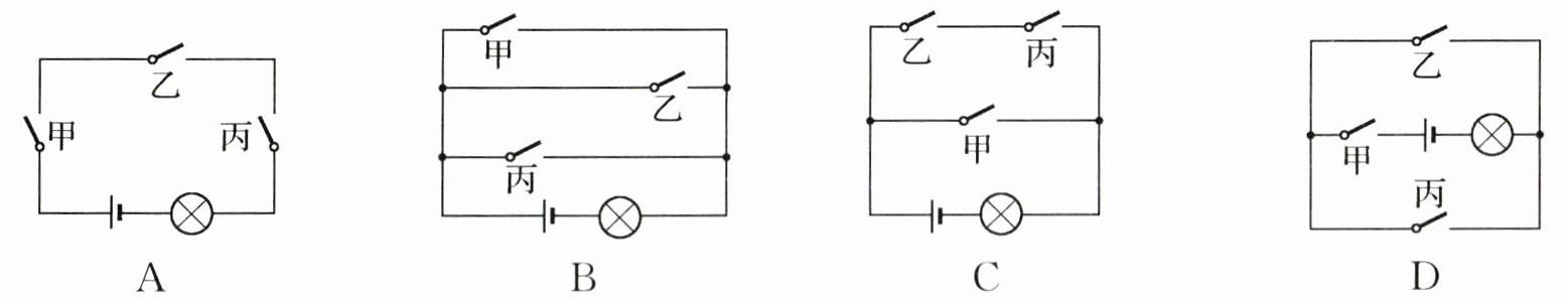 11. 某举重比赛有甲、乙、丙三名裁判,其中甲为主裁判,乙、丙为副裁判.若裁判认定杠铃已被举起,就闭合自己前面的按钮开关.当主裁判和至少一名副裁判均判定杠铃举起时,指示灯泡发光,表明运动员举重成绩有效,以下符合这一要求的电路是( )