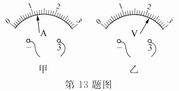 13. 图甲中电流表分度值为______A;图乙中电压表示数为______V;图甲中电流表在使用时,应使电流从______接线柱流入电表.