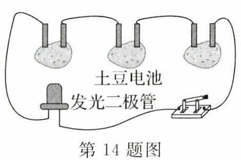 14. 小明利用"土豆电池"连成如图所示的电路,图中这些电池是______联的,这些"电池"将______能转化为电能,开关闭合后发光二极管点亮是因为电路中有______通过.
