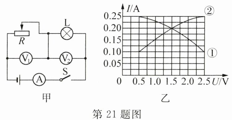 21. 探究串联电路特点时,小明连接的电路如图甲所示,其中电源电压恒定,滑动变阻器的滑片在某两点间移动时,电压表$V_1$和$V_2$的示数随电流表A示数变化的关系分别如图乙中的①和②.由图可知灯L的电阻随电流增大而______,电源电压为______V;当滑动变阻器和灯泡阻值相等时,电路的总电阻为______Ω;当滑片移至某位置时,灯泡电阻为6 Ω,此时滑动变阻器接入电路的阻值为______Ω.