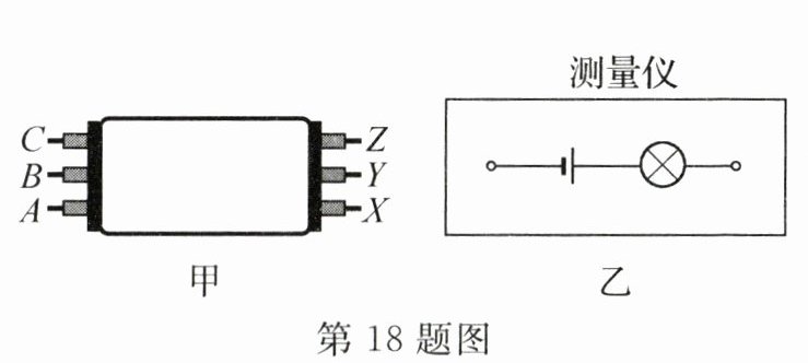 18. 新素养 科学思维 如图甲所示,高层建筑的墙体中有三根绞在一起的电线,可以用如图乙所示的"测量仪"连接在XYZ端把它们区分开.将A和C拧在一起时,当"测量仪"连接在X、Y两端,灯泡发光,则______是同一根电线;接着拆开A和C,将A和B拧在一起,测量仪一端必须与______(选填"X""Y"或"Z")相连,另一端导线连接______次电路能将导线辨别开.