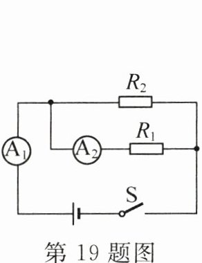 19. 如图是天然气安全监控的模拟电路.电源电压不变$,R_1$是气敏电阻$,R_2$是定值电阻.气敏电阻的阻值会随天然气浓度的升高而减小.闭合开关S,若天然气泄漏,电流表$A_2$示数______,电流表$A_1$和$A_2$示数之比______,电流表$A_1$和$A_2$示数变化量之比______.(均选填"增大""减小"或"不变")