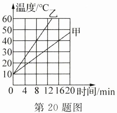 20. 小丽用相同的电加热器分别对甲、乙两杯水进行加热,得到的实验数据如图所示.已知甲杯中水的质量为0.2 kg,在16 min内甲杯中水吸收的热量为______J,若这些热量全部由燃气热水器提供,则至少需要完全燃烧$______m^3$的天然气.乙杯中水的质量为______kg.[c水$= 4.2×10^3J/(kg·℃),q$天然气$= 4.0×10^7J/m^3]$