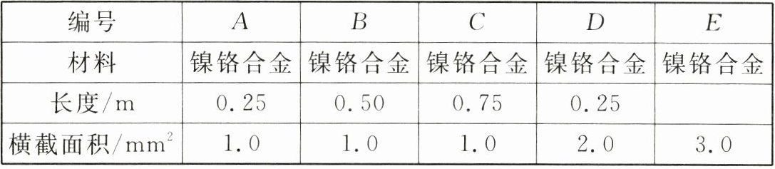 (3) 为了探究导体电阻的另一影响因素,他在M、N之间分别接上A、D和E三根电阻丝,其中电阻丝E的长度应为______m,这种实验方法叫______法.