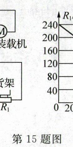 15. (5 分)图甲是跨学科实践小组用力敏电阻$ R_1$设计的一种“自动限重器”,力敏电阻$ R_1$的阻值随压力 F 变化的关系如图乙.当货架承受的压力达到限定值时,电磁继电器会自动控制货物装载机停止向货架上摆放物品.已知控制电路的电源电压 U= 6V,定值电阻$ R_2= 60Ω($货架自重和线圈电阻都忽略不计).