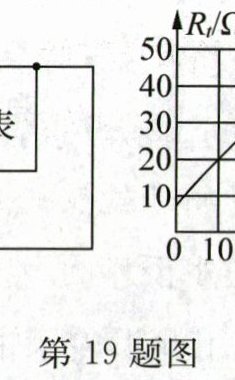 19. 图甲是一种测温电路,温度表由量程为 3 V 的电压表改装而成,电源电压 U 恒为 6 V,R 的阻值为 40 Ω,热敏电阻的阻值Rₜ随温度 t 变化的关系图像如图乙所示.则电路可测量的最高温度为______℃,温度表的 10℃应标在电压表______V 刻度处;若仅将 U 减小,电路可测量的最高温度将______(选填“增大”或“减小”,下同);若将 R 增大,电路可测量的最高温度将______.