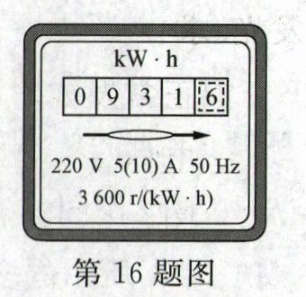 16. 电能表是测量消耗______的仪表.小明家上次查看电能表的读数为091166,本次查看时电能表读数如图所示,则他家这段时间内消耗的电能为______度;若关闭家中其他电器,只让一个标有“220 V 1000 W”的电热水器正常工作 10 min,消耗的电能为______J,电能表的铝盘转______转.