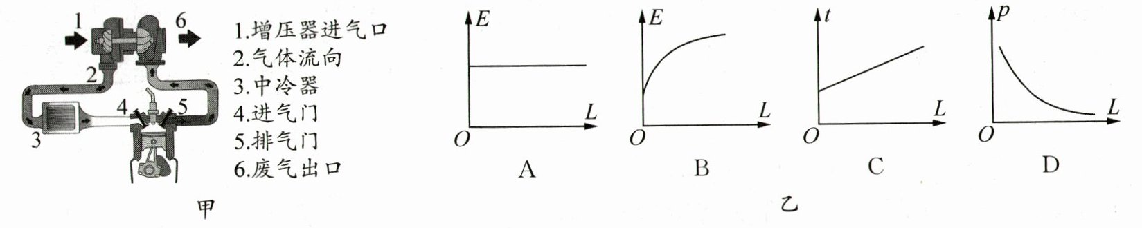(4)压缩冲程汽缸内气体的压强为 p、内能为 E、温度为 t、活塞距离汽缸顶端(火花塞一端)距离为 L,则图乙图像中正确的是______.