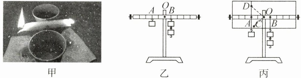 26. 新趋势 创新实验 (14分)(2024·山东淄博)同学们利用蜡烛、细铁丝、杯子等制作了一个蜡烛"跷跷板",如图甲.一端烛油滴下时,此端就上升,两端交替上下.为了寻找上述现象的原因,同学们用铁架台、杠杆(已在水平位置平衡)、质量相等的钩码等器材进行以下探究.