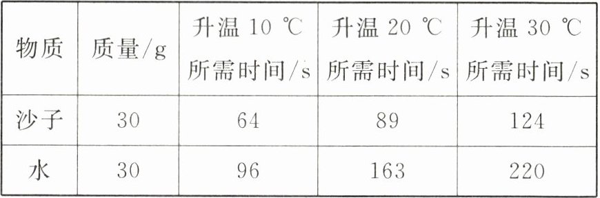 |物质|质量/g|升温10℃所需时间/s|升温20℃所需时间/s|升温30℃所需时间/s|