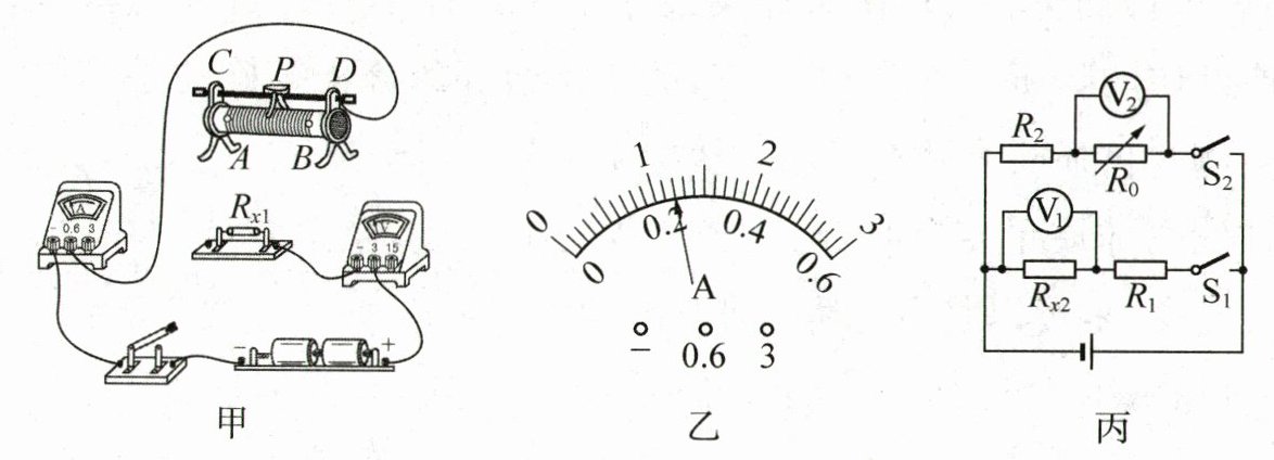 (2)用图丙所示的电路可以测出$Rₓ_2$的阻值.图中有两只阻值已知分别为$R_1$和$R_2$的定值电阻,R₀为电阻箱,电源电压恒定.