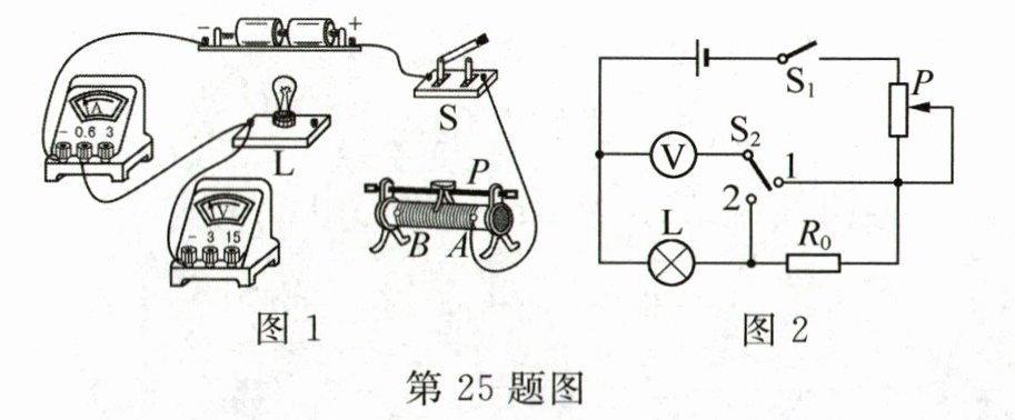 (7) 完成实验后,小组又设计了如图2所示的电路图,测量该小灯泡L正常发光时的电阻,$R_{0}$为定值电阻,$S_{2}$为单刀双掷开关,实验步骤如下: