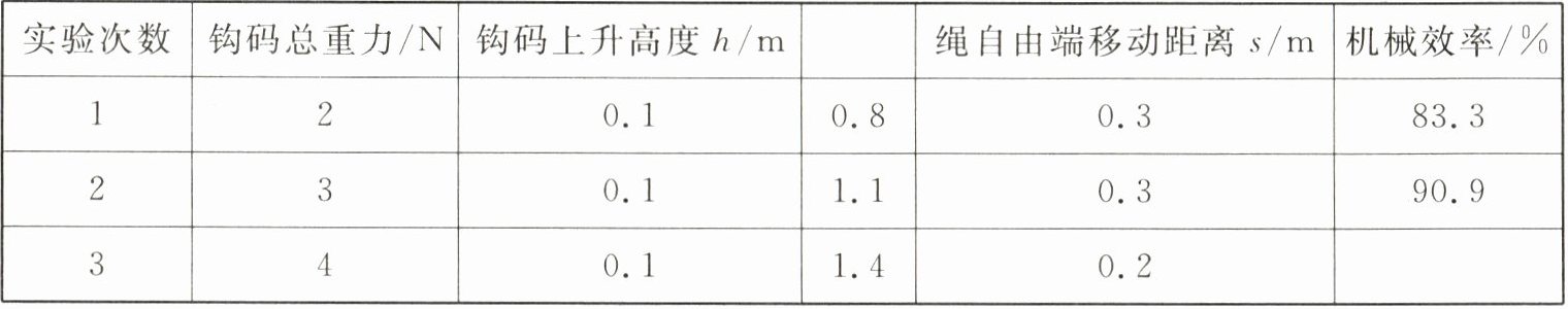 |实验次数|钩码总重力/N|钩码上升高度 h/m| |绳自由端移动距离 s/m|机械效率/%|