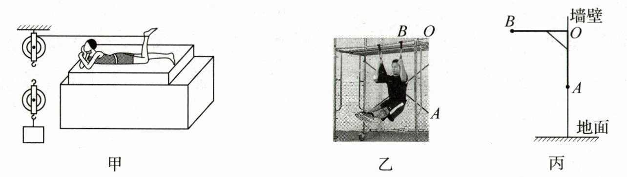 (2)新趋势 情境素材 如图乙是小明悬吊在单杠训练器上锻炼身体时的情景,图丙是训练器的简化图,A 点和 O 点固定在墙壁上,小明悬吊在训练器时,AOB 可以看作一个杠杆,O 为支点,B 为动力作用点,A 为阻力作用点,请画出动力$F_{1}$、阻力$F_{2}的示意图和动力臂l_{1}.$