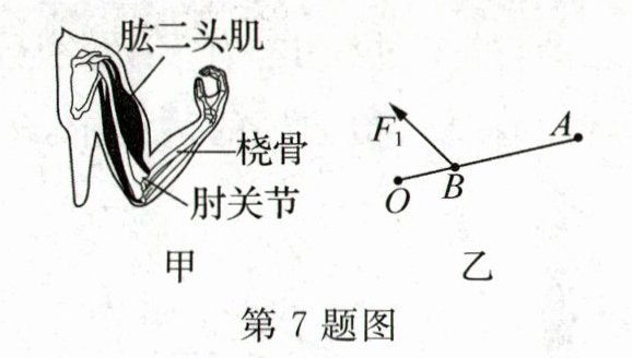 7. (4 分)(2024·山东枣庄)用手提起重物时,前臂可简化为杠杆:桡骨在肱二头肌牵引力$F_{1}$的作用下,绕肘关节(支点 O)转动,如图甲,请在图乙中画出动力$F_{1}的力臂L_{1}和阻力F_{2}$的示意图.