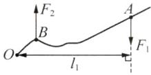 (1)(2024·山东日照)甲图是使用核桃夹的情形,乙图是把核桃夹上臂简化成的杠杆,A 为大拇指对核桃夹力的作用点,B 为核桃对核桃夹力的作用点.请在乙图中画出作用在核桃夹上臂的动力$F_{1}$、动力臂$l_{1}和阻力F_{2}.$