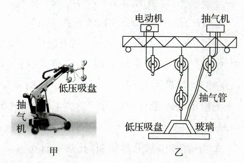 15. (11分)玻璃装运车间常用“低压吸盘吊车”吊运玻璃,如图甲所示,先将多个吸盘压在玻璃上,然后启动抽气机抽出吸盘内空气使吸盘内的气压减小,在大气压作用下吸盘将玻璃“吸住”,再通过电动机牵引滑轮组自由端的绳子就可以将玻璃吊起.图乙为“低压吸盘吊车”的结构示意图,若吸盘及支架的总质量为45 kg,每个滑轮的质量为15 kg,不计抽气管和绳重,不计绳子与滑轮的摩擦,在某次吊装过程中,吊车将一块重为90 kg的玻璃以0.4 m/s的速度吊高2 m.g取10 N/kg,求: