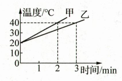 D 解析:由图可知,甲容器中水升温较快,甲、乙两容器所装的都是水,水的比热容相同,故A错误;由图可知,甲容器中水加热2分钟时升高的温度$Δt=40^{\circ}C-20^{\circ}C=20^{\circ}C,2$分钟内水吸收的热量$Q_{吸}=cm_{甲}Δt=4.2×10^{3}J/(kg·^{\circ}C)×1kg×20^{\circ}C=8.4×10^{4}J,$则甲容器中水每分钟吸收的热量$Q_{吸1}=\frac{1}{2}Q_{吸}=\frac{1}{2}×8.4×10^{4}J=4.2×10^{4}J,$故B错误;由图可知,乙容器中水加热3分钟时升高的温度$Δt=40^{\circ}C-20^{\circ}C=20^{\circ}C,Q_{吸}'=3Q_{吸1}=3×4.2×10^{4}J=1.26×10^{5}J,$由Q_{吸}=cmΔt可得,乙容器中所装水的质量$m=\frac{Q_{吸}'}{cΔt}=\frac{1.26×10^{5}J}{4.2×10^{3}J/(kg·^{\circ}C)×20^{\circ}C}=1.5kg,$故C错误;加热9min,两容器中水吸收的热量相等,均为Q_{吸}''=9Q_{吸1}=9×4.2×10^{4}=3.78×10^{5}J,由Q_{吸}=cmΔt可得,甲、乙容器中水升高的温度分别为$Δt_{甲}=\frac{Q_{吸}''}{cm_{甲}}=\frac{3.78×10^{5}J}{4.2×10^{3}J/(kg·^{\circ}C)×1kg}=90^{\circ}C、$$Δt_{乙}=\frac{Q_{吸}''}{cm}=\frac{3.78×10^{5}J}{4.2×10^{3}J/(kg·^{\circ}C)×1.5kg}=60^{\circ}C,$则甲中水的末温$t_{甲}=90^{\circ}C+20^{\circ}C=110^{\circ}C,$乙中水的末温$t_{乙}=60^{\circ}C+20^{\circ}C=80^{\circ}C,$由于在1标准大气压下,水的沸点为$100^{\circ}C,$故甲中水的末温为$100^{\circ}C、$乙中水的末温为$80^{\circ}C,$所以甲、乙容器中水的末温之比为$100^{\circ}C:80^{\circ}C=5:4,$故D正确.
