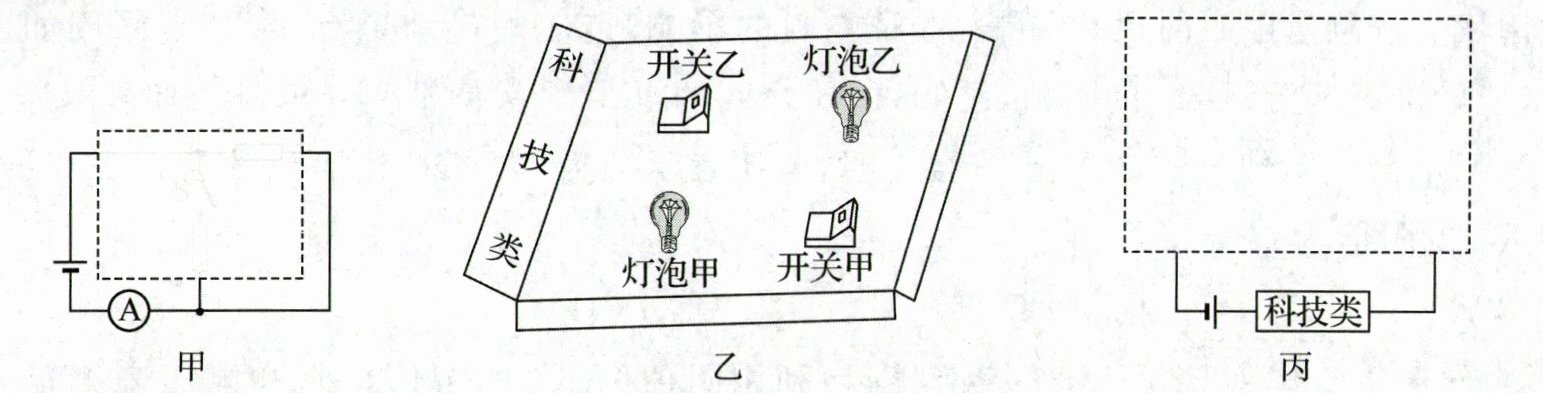 (2) 新趋势 情境素材 (2025·四川成都月考)某次知识竞赛中,题目涉及科技、文学、历史、民俗等多方面,每一类题是一块独立的答题板,双方各有一次答题机会,其中科技类题答题板如图乙.开始时,双方的灯都亮着,若甲队回答正确,闭合开关Sₐₐ,为乙队灭灯;若乙队回答正确,闭合开关S乙,为甲队灭灯;显示"科技类"的电子屏幕一直亮着,最后比较双方剩余(亮着)的灯数决定胜负.请在图丙的虚线框中将电路图补充完整.