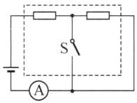 (1) 如图甲所示的电路,电源电压保持不变,虚线框内的电路中接有两个阻值相同的电阻.当开关S由闭合到断开时,电流表的示数减小到一半.请在虚线框内画出连接的电路图.