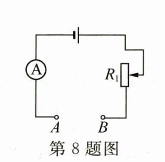 8.新素养·科学思维 (6分)某科技创新小组制作了一个直接测量电阻阻值的仪器,称之为欧姆表,连接的电路如图,制作步骤如下:在A、B之间连接导线,调节滑动变阻器$R_1,$使电流表示数为0.6 A(即满量程),把电流表的"0.6 A"刻度线标为0Ω;保持$R_1$接入电路的阻值不变,当在A、B之间接一阻值为80Ω的电阻时,电流表示数为0.3 A.此时滑动变阻器$R_1$接入电路的阻值为______Ω,把"80Ω"数值标在电流表刻度"0.3 A"处;据此原理,通过计算可以把电流表的刻度改为相应的电阻值,则在电流表刻度"0.02 A"处应标的电阻值为______Ω,改装成的欧姆表的刻度是______(选填"均匀"或"不均匀")的.