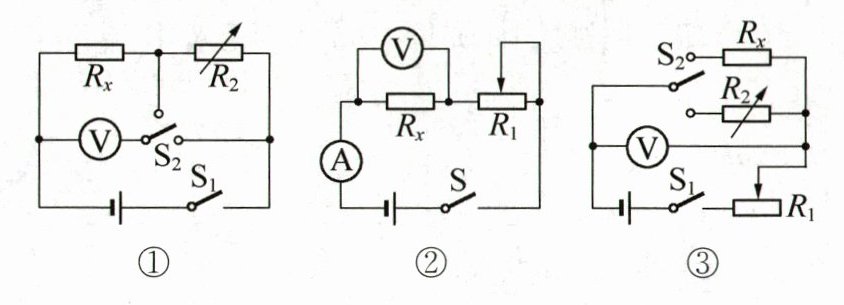 5.待测电阻Rₓ的阻值约为500Ω.提供的器材有:两节新干电池,电压表(量程为0~3 V、0~15 V)、电流表(量程为0~0.6 A、0~3 A)、滑动变阻器$R_1(10Ω 1 A)、$电阻箱$R_2(0~999Ω 5 A)$各一个,开关、导线若干.小华设计的三个电路如图所示,其中能准确测出Rₓ阻值的有( )