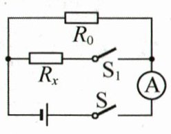 6.(2分)(2025·江苏苏州期中)若实验室只有一个电流表和一个已知阻值为R₀的定值电阻,小强设计了如图所示的电路测量未知电阻Rₓ的阻值,实验步骤如下:① 闭合开关S、断开开关$S_1,$读出电流表示数为$I_1;② $闭合开关S、$S_1,$读出电流表示数为$I_2;③ $计算出待测电阻Rₓ= ______(用R₀、$I_1、$$I_2$表示).