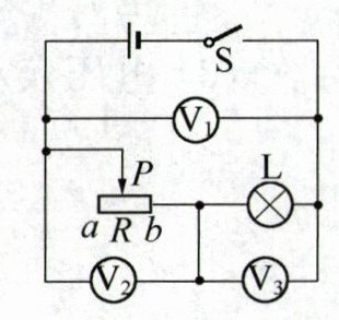 4. 如图,电源电压为3V且恒定不变,当开关S闭合后,滑动变阻器的滑片P从a端滑向b端的过程中,三只电压表示数变化的数值分别为$ΔU_1、$$ΔU_2、$$ΔU_3.$下列情况可能出现的是( )