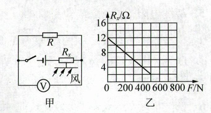 D 解析:由图甲可知,R与Rₓ串联,电压表测R两端的电压,由图乙可知,无风时Rₓ=12 Ω,此时电路中的电流I=U/R+Rₓ=12 V/4 Ω+12 Ω=0.75 A,则电压表的示数Uᵣ=IR=0.75 A×4 Ω=3 V,故A错误;由图乙可知,风力增大时,力敏电阻的阻值减小,电路的总电阻减小,由I=U/R可知,电路中的电流变大,故B错误;当电压表示数为6 V,即Uᵣ'=6 V时,电路中的电流I'=Uᵣ'/R=6 V/4 Ω=1.5 A,Rₓ两端的电压Uₓ=U-Uᵣ'=12 V-6 V=6 V,则力敏电阻的阻值Rₓ'=Uₓ/I'=6 V/1.5 A=4 Ω,由图乙可知,此时的风力为400 N,故C错误;当所测风力最大时,Rₓ的阻值最小,电路中电流最大,则电压表的示数最大,即Uᵣ大=8 V,Rₓ两端的电压Uₓ'=U-Uᵣ大=12 V-8 V=4 V,电路中的电流I''=Uᵣ大/R=8 V/4 Ω=2 A,则力敏电阻的阻值Rₓ''=Uₓ'/I''=4 V/2 A=2 Ω,由图乙可知,该装置所能测量的最大风力为500 N,故D正确.