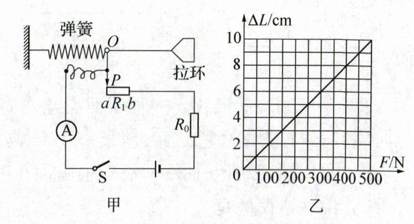 13. (12分)图甲是某款可用电流表显示拉力大小的测力计原理图$,R_1$的最大阻值为30Ω,ab长10cm,其阻值与长度成正比.滑片P上端固定在拉杆上的O点,当弹簧处于原长时,滑片P位于a端.电源电压恒为6V,R₀的阻值为3Ω,电流表量程为0~0.6A.弹簧的伸长量ΔL与所受力F之间的关系图像如图乙所示.求: