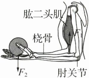 5.新趋势 学科融合 肱二头肌收缩产生的力使前臂骨骼绕肘关节转动,此时前臂骨骼可以看成一个杠杆模型,简称前臂杠杆.如图所示,手提重物时,对前臂杠杆的分析错误的是( )