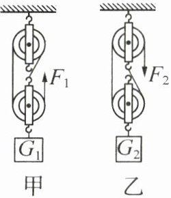 7.如图所示,每个滑轮的重力相等,不计绳重和摩擦,$G_{1}= 60N$,$G_{2}= 38N$.甲、乙两种情况下,绳子在大小相等的拉力$F_{1}$、$F_{2}$的作用下静止,则每个动滑轮的重力为( )