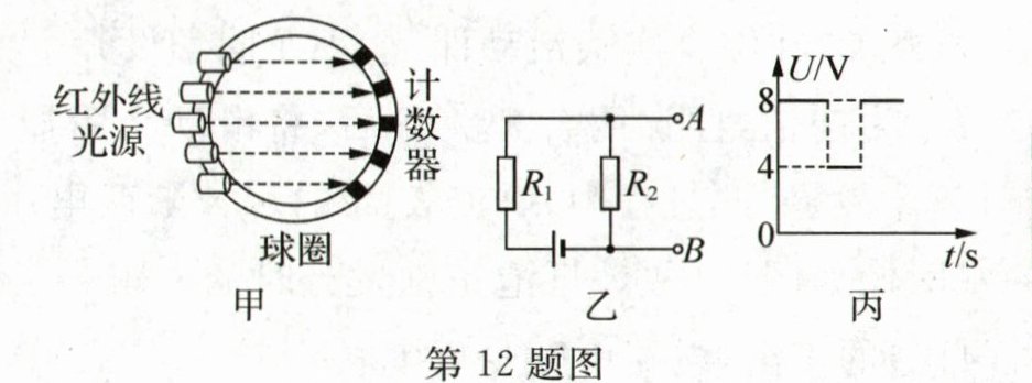 12. (2025·福建厦门期中)抛绣球是壮族人民喜爱的民俗活动之一.小天设计了一个自动记录绣球过圈数量的计数器(如图甲),其简化电路如图乙.其中$R_{1}$是光敏电阻,当绣球挡住了射向$R_{1}$的红外线时,$R_{1}$的阻值会变小为10Ω,A、B间电压变大,这时自动计数器计数一次.已知$R_{2}$是定值电阻,电源电压恒为12V,当绣球穿过球圈时,A、B间的电压随时间变化的图像如图乙,则$R_{2}$的阻值为______Ω;当没有绣球通过球圈,红外线正常照射$R_{1}$时,$R_{1}$的阻值为______Ω.
