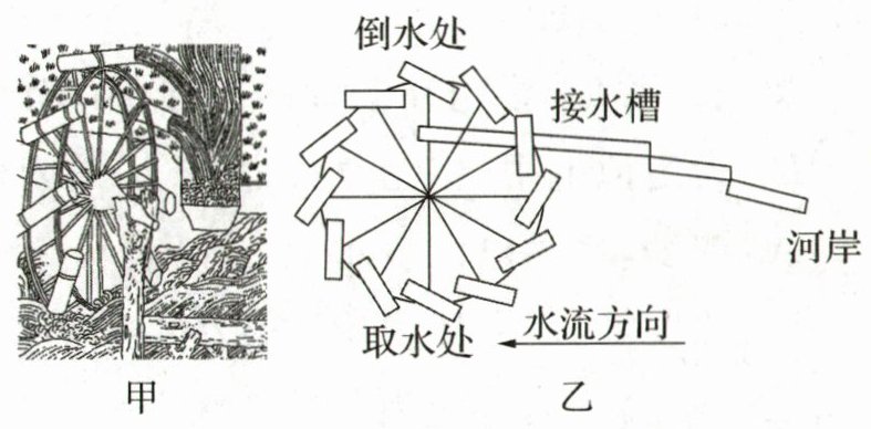 13. (6分)(2025·江苏盐城期中)《天工开物》是我国古代的科学著作,书中记载着大量的古代农业机械.其中这样写道:"凡河滨有制筒车者,堰陂障流绕于车下,激轮使转,挽水入筒,一一倾于枧内,流入亩中,昼夜不息,百亩无忧."该段文字描述了筒车这种以水流作动力,用来取水的机械,如图甲.如图乙,接水槽离取水处高4m,水轮上有12个取水筒,一个取水筒每次可取水4kg,筒车旋转一周所用时间为60s.若水流冲击筒车的功率为40W(接水槽离倒水处的高度忽略不计,g取10N/kg)